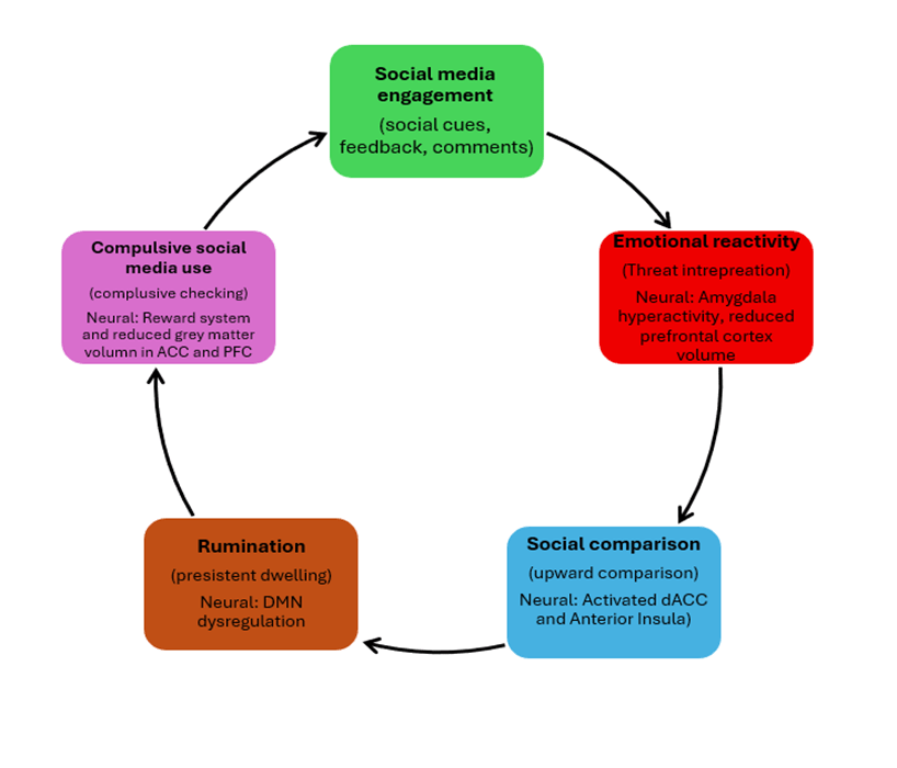 The four mechanisms do not operate in isolation but form a dynamic, interconnected cycle (see Figure 3). The cycle typically begins when a neurotic individual encounters an ambiguous or potentially threatening social media cue (e.g., a lack of likes). This is proposed to trigger heightened emotional reactivity, driven by amygdala hyperactivity27,28,29, resulting in immediate negative affect. This emotional response may then prompt upward social comparison, activating the dACC and anterior insula34,36, which are linked to feelings of envy and inadequacy. Such comparisons could fuel rumination, facilitated by a dysregulated Default Mode Network that becomes stuck in self-referential, negative thought loops54,55. To escape this aversive state, the individual may engage in compulsive checking and use, seeking transient dopamine-mediated relief through social feedback48,51. Subsequently, these behaviors could increase exposure to other triggers and restart the cycle.