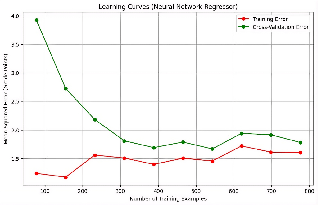 Although the neural network regressor achieved a high R² score (0.98) and a low Mean Squared Error (2.0) on the test set, these strong metrics raise the possibility of overfitting. To reduce this risk, the study used a 5-fold cross-validation procedure during hyperparameter tuning, which helps ensure that the model generalizes across multiple subsets of the data rather than learning patterns specific to a single split. The cross-validation mean and standard deviation further provide evidence of the model’s stability. Moreover, the convergence of training and validation errors observed in the learning curves (see Fig. 3) provides visual evidence that the model is stable and not suffering from overfitting.