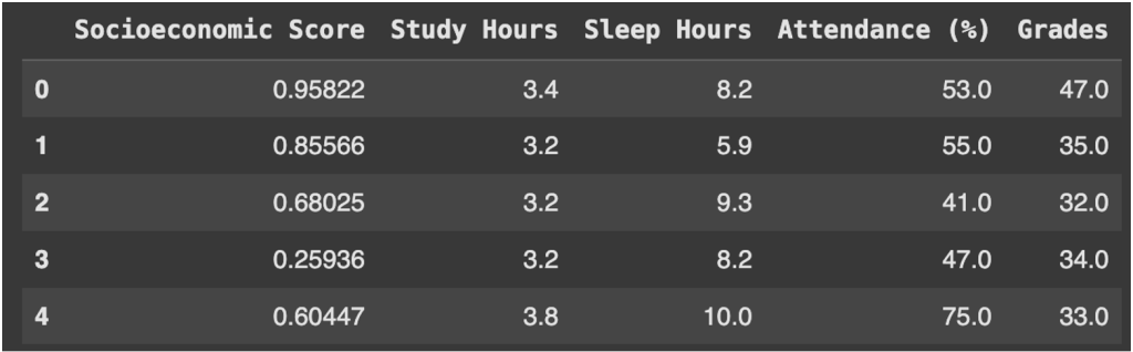 This project is carried out using Google Colab’s CPU environment. The primary Python packages used are sklearn12, pandas13, and matplotlib14. In this project, pandas is used for data loading and preprocessing, scikit-learn is used to implement the neural network regressor and conduct hyperparameter tuning, and matplotlib is used to generate visualizations. The goal of the project is to perform regression analysis to predict students’ grades based on various inputs and factors. The dataset used for this project contains 2000 rows (data points), 4 feature columns, and 1 target column (see Table 1). This dataset was obtained from a publicly available Kaggle repository15, where it was generated synthetically for educational and demonstration purposes. It does not contain records of actual human subjects, nor does it include any Personally Identifiable Information (PII) such as names, student IDs, or specific location data. The features (study hours, sleep hours, socioeconomic score, and attendance) were created using simulated distributions designed to resemble typical student behavior and performance patterns. The target variable predicted is the student’s final grade (values ranging from 0-100).