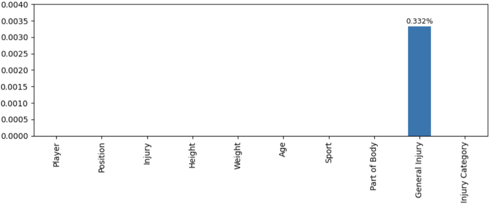 Missingness across key variables was assessed prior to model training (Figure 1). Missingness was minimal (<0.5%), with only the General Injury field exhibiting missing values (0.332%). Rows containing missing entries were removed without imputation. Numeric features were retained without normalization due to the tree-based nature of the model, and categorical variables were one-hot encoded. Player identifiers were retained exclusively for group-aware validation and were not used as predictive features.