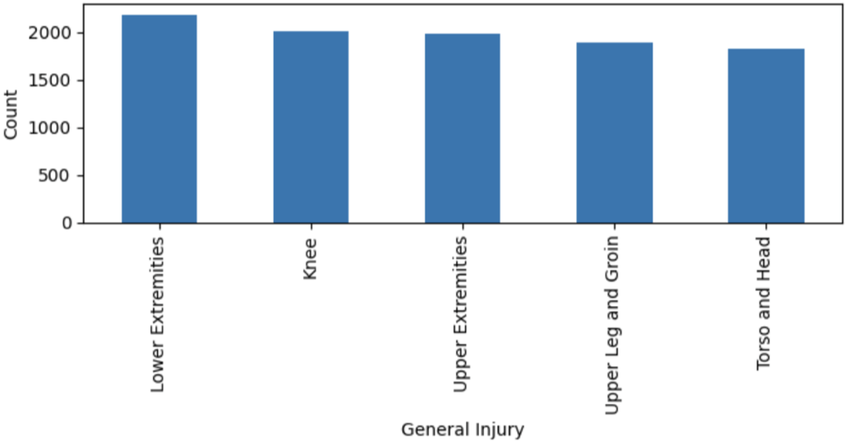 Raw injury descriptions vary widely in specificity and frequently reference overlapping anatomical regions. To reduce label ambiguity and enforce mutual exclusivity, injuries were manually reclassified into four anatomically distinct categories according to a predefined schema (Table 1). Although injuries within the same anatomical region may have different biomechanical etiologies, the objective of this study is anatomical localization rather than injury mechanism.