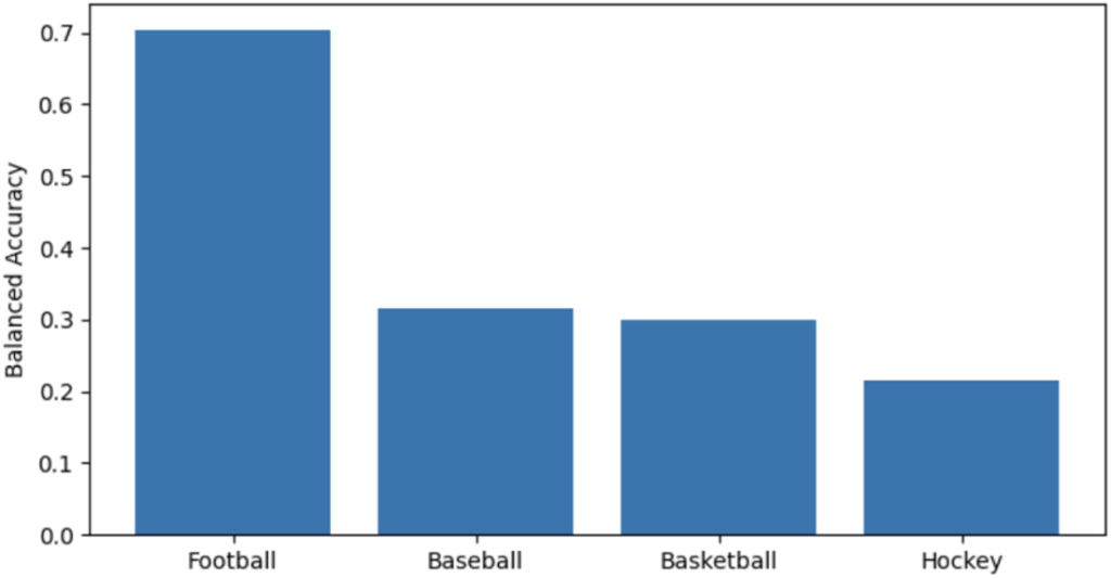 When models were trained and evaluated within individual sports, performance improved across several metrics. Balanced accuracy exceeded 0.70 in certain sports (Figure 4), indicating that sport-specific biomechanics and exposure patterns provide meaningful contextual constraints. These improvements suggest that aggregating across sports introduces heterogeneity that obscures injury patterns unique to each sport.