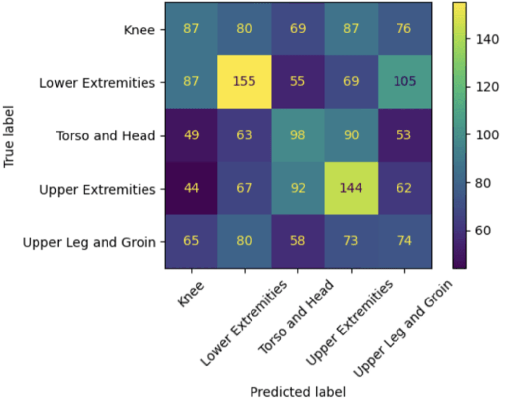 Under a global four-class classification setting, the Random Forest model achieved a balanced accuracy of approximately 0.52 and a macro F1 score of 0.51. The confusion matrix (Figure 3) reveals substantial overlap between anatomically adjacent classes, particularly between knee injuries and non-knee lower-body injuries. This pattern reflects shared biomechanical mechanisms and overlapping injury descriptions that persist despite reclassification.