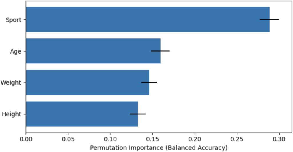 Permutation feature importance analysis revealed that sport and player position contributed more predictive signal than age, height, or weight (Figure 7). Anthropometric features exhibited relatively low importance, consistent with prior findings that demographic variables alone are weak predictors of injury outcomes.