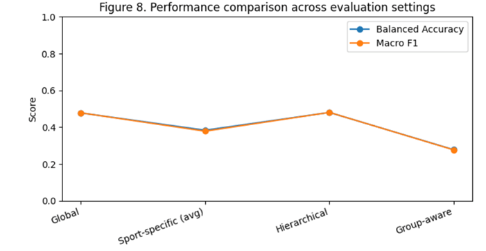 A comparison of balanced accuracy and macro F1 score across evaluation settings is shown in Figure 8. Performance improved as contextual constraints increased (sport-specific and hierarchical settings) but declined under group-aware validation. This trade-off illustrates the tension between model expressiveness and generalization, emphasizing the limitations of sparse feature sets for injury location prediction.
