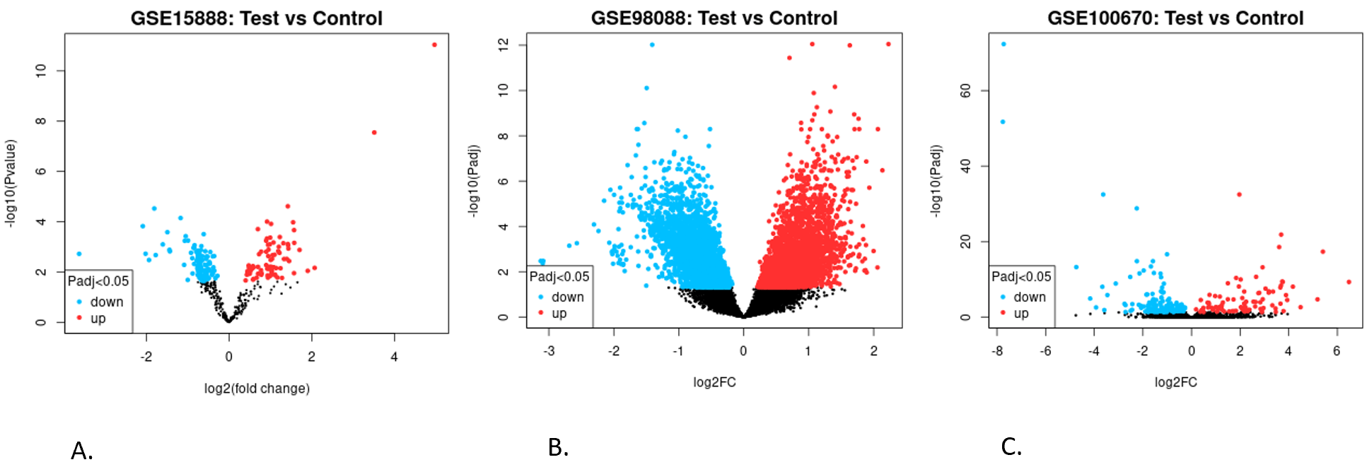 Figure 1 | Volcano plots showing the differential expression of genes and miRNAs from the GSE studies. The x-axis on the graphs shows the fold change, and the y-axis shows the p-value. The blue points indicate downregulation, and the red points indicate upregulation. Points farther from the centre and higher on the graph are considered more differentially expressed. A. This shows the differential expression of miRNAs from GSE15888, B. This shows the differential expression of genes from GSE98088 and C. This shows the differential expression of genes from GSE100670.