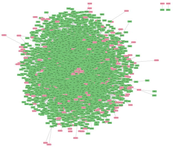 Figure 2 | A gene-miRNA interaction network for neurodevelopment disorders visualised using Cytoscape. The gene nodes are shown as green rectangles, and the miRNA nodes are shown as pink rectangles. The grey lines are the edges that show the interactions between genes and miRNAs.