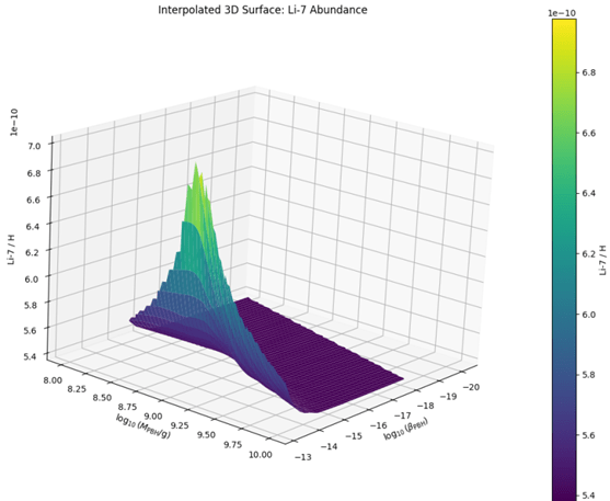 Our code tracks the effect of total energy injection on the BBN plasma but does not separately model hadronic showers, which arise when emitted quarks and gluons hadronize and interact with light nuclei. These non-thermal processes can be especially important for altering neutron-to-proton ratios and dissociating helium or lithium nuclei. A full treatment of hadronic cascades using transfer functions or Monte Carlo shower simulations would be necessary to rigorously quantify these effects22.