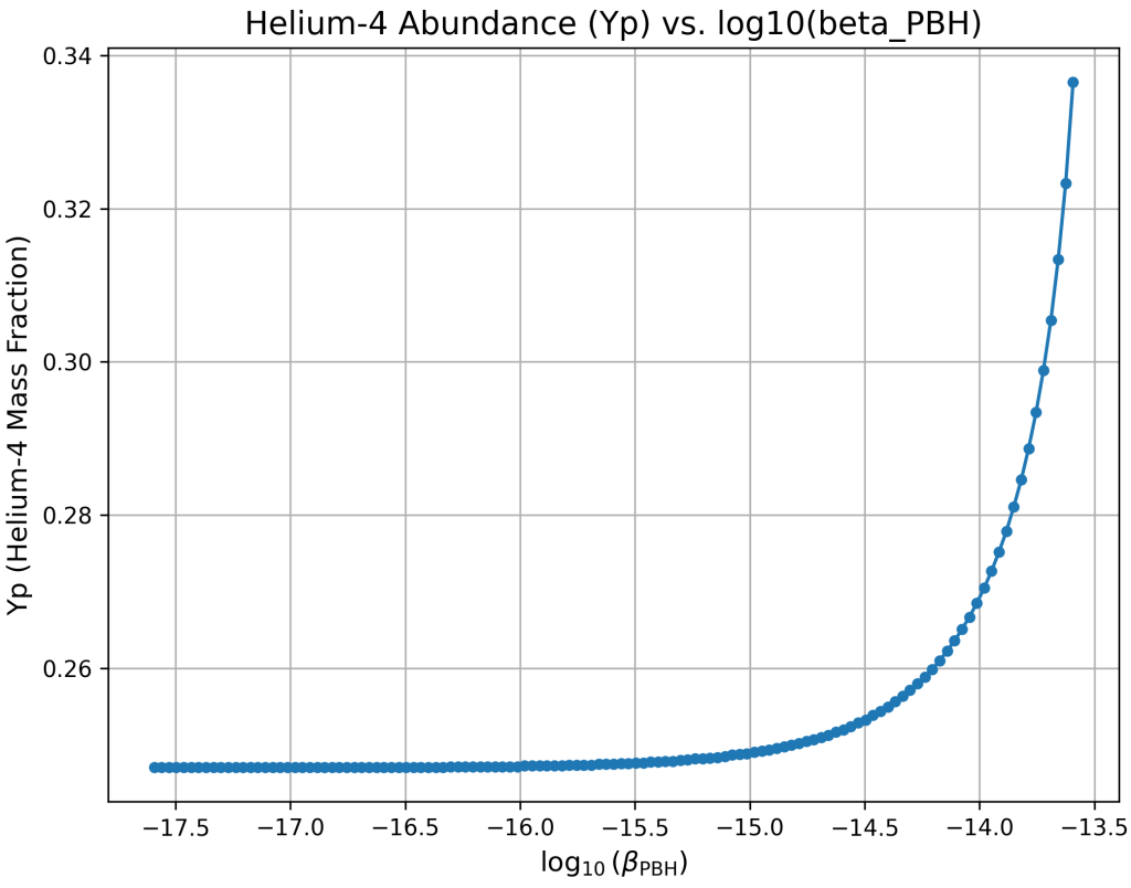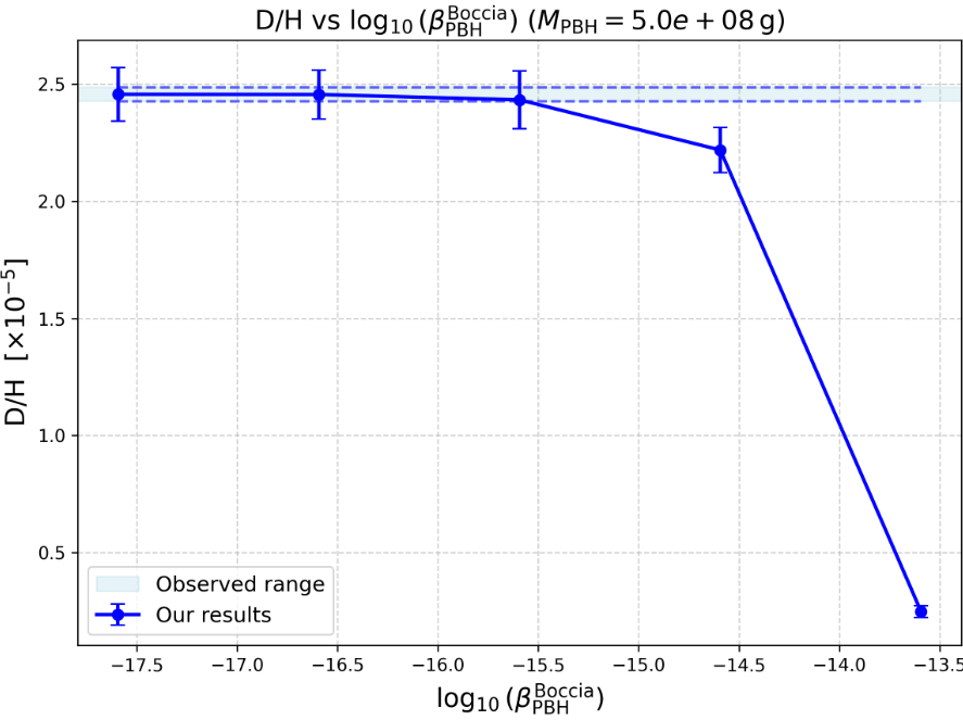 . While this choice allows for clear isolation of effects near critical evaporation timescales, it neglects the possible influence of broader or extended mass functions, which are generally expected in realistic early-universe collapse scenarios. Such spectra could lead to energy injection over a wider time window, with cumulative effects on nuclear reaction rates, freeze-out, and photodisintegration processes. Future work should consider log-normal, power-law, or critical collapse-inspired distributions to assess whether such effects could shift or even alleviate the lithium problem6.