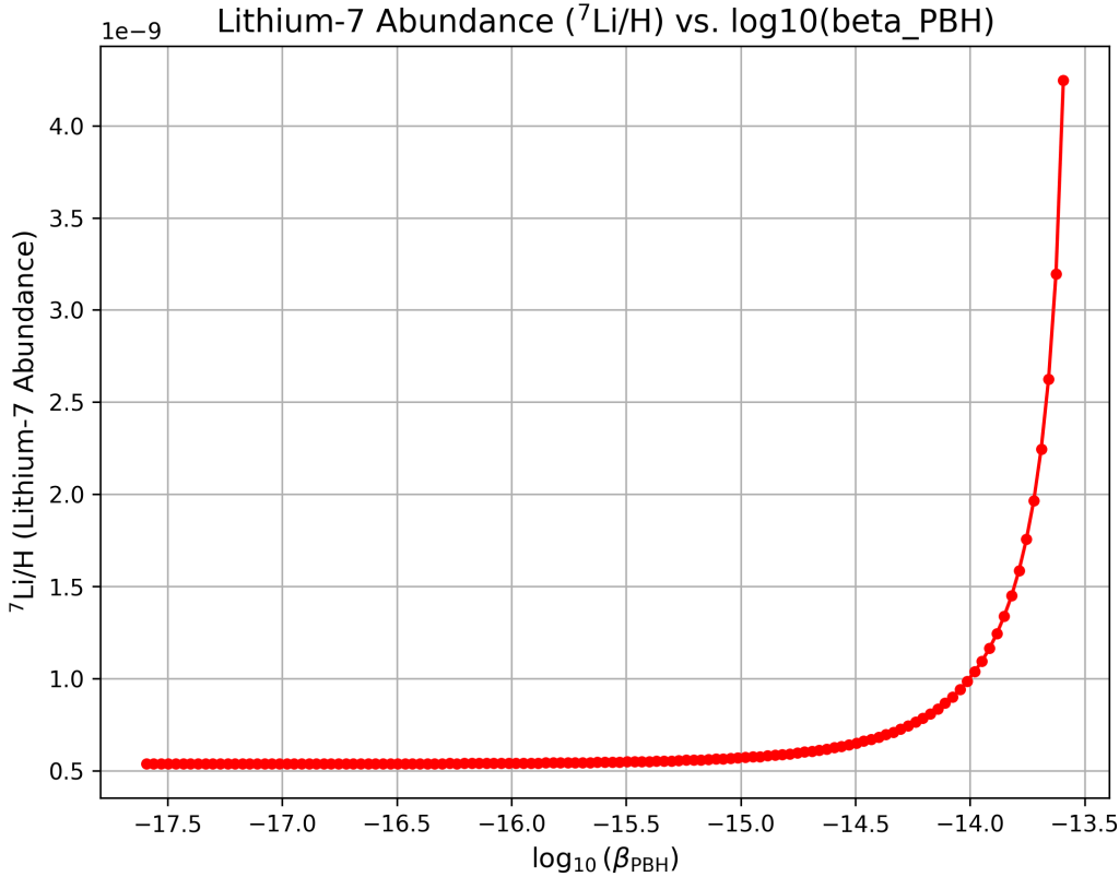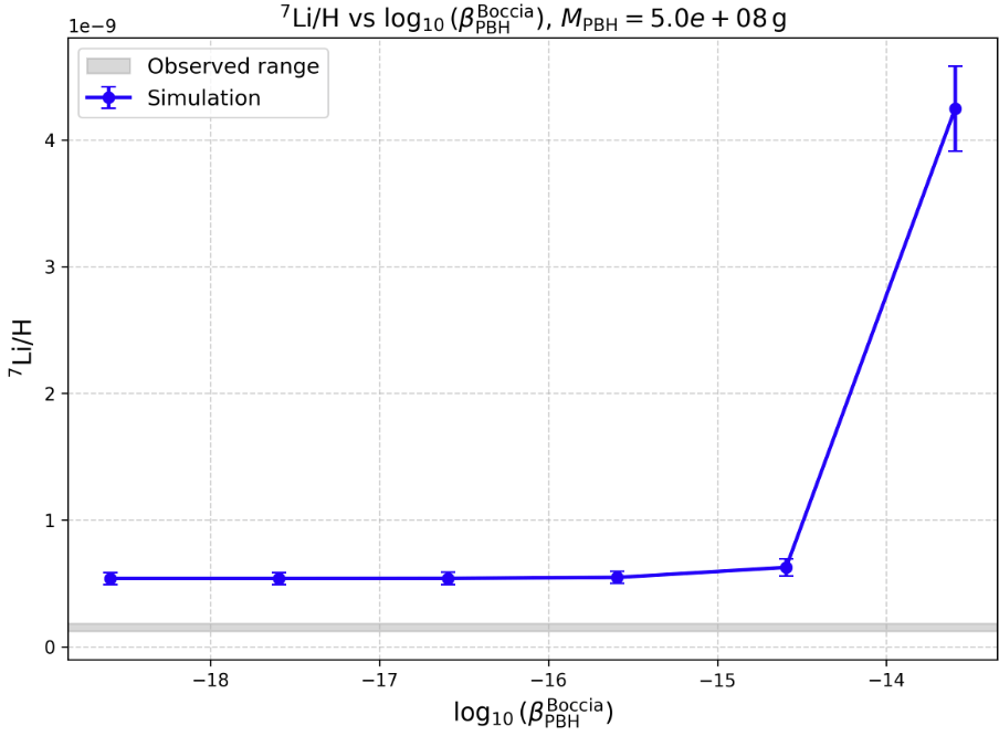 This PBH mass was chosen deliberately, as it corresponds to evaporation occurring near the peak of BBN, when modifications to nuclear reaction rates and freeze-out dynamics would be expected to have the greatest potential impact on lithium production. The fact that PBHs in this optimally timed mass window worsen rather than alleviate the lithium problem therefore provides a robust negative result, effectively closing off this region of PBH parameter space as a viable solution.