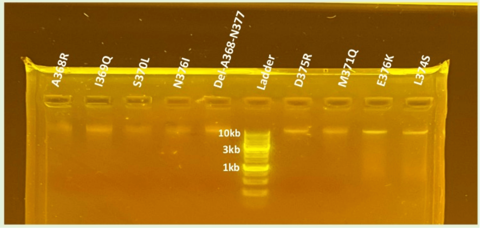 Following site-directed mutagenesis, gel electrophoresis confirmed successful amplification of the wild-type and mutant BMP-2 plasmids. As shown in Figure 2, bands were observed for all plasmid DNA constructs verifying amplification of the DNA. Given the consistently strong bands observed for WT, D375K, N376I, and Del-A368-N377, it was sufficient to conclude that both the mutant plasmids were intact and had the appropriate size.