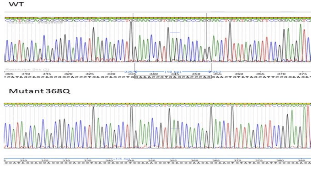 In addition, validation of mutation and wild-type sequences were confirmed by Sanger sequencing. Figure 3 shows a representative chromatogram displaying a successful mutation (368Q) with the wild-type sequence ensuring that the desired amino acid mutations were introduced and that the PCR (site-directed mutagenesis) did not introduce additional off-target mutations. Using Chi-Square analysis, we determined that the wild type’s and D375K’s absorbance and protein concentration are independent of each other, showing a significant difference between the two protein variations.