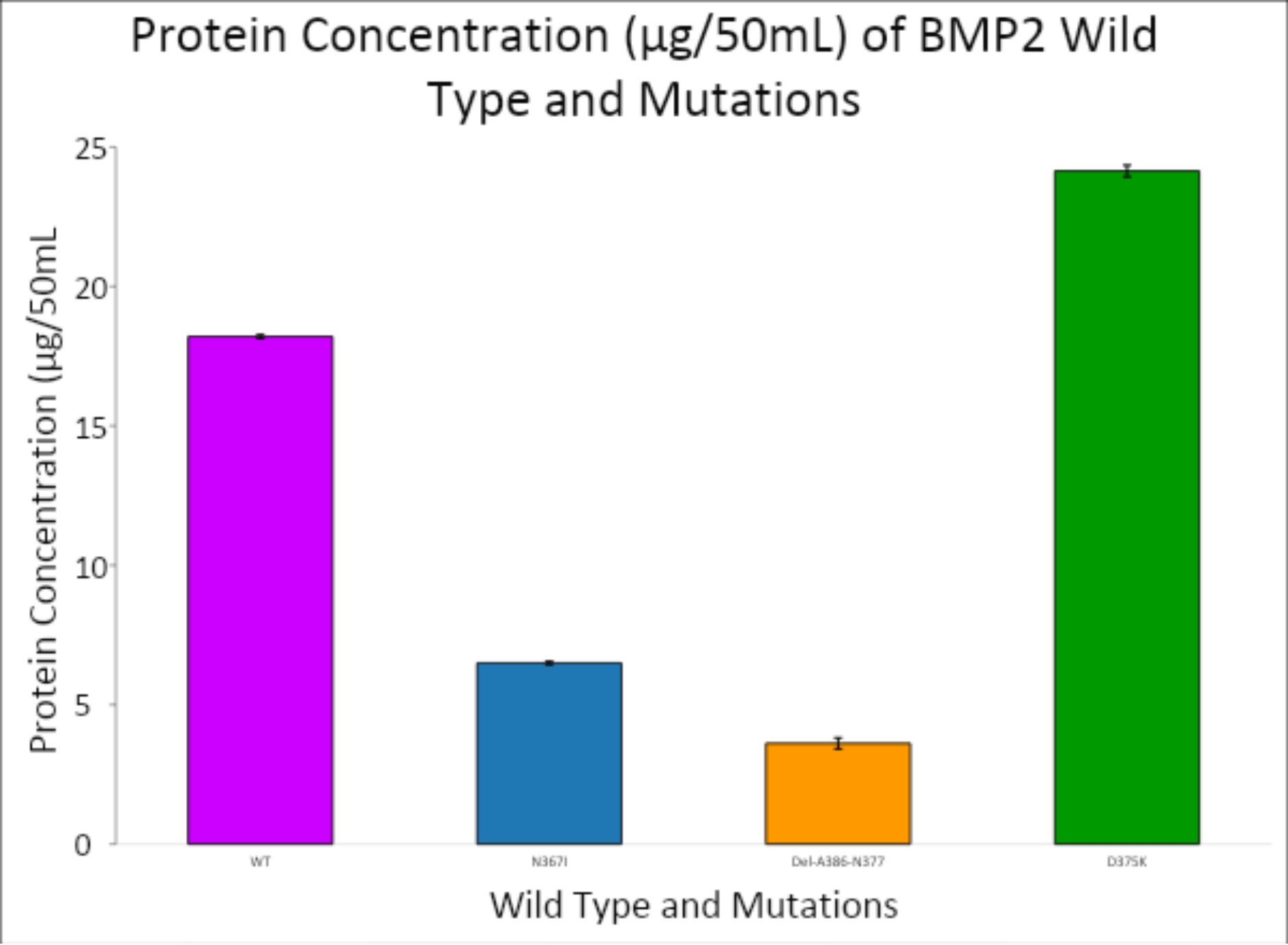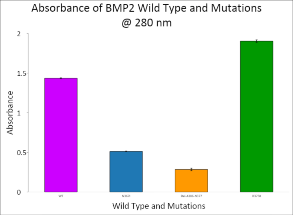 The results of this study show the promise of engineered BMP-2 mutations, specifically D375K, to have a positive increase in protein expression, and possibly, osteogenic function. D375K had the greatest absorbance at 280 nm (1.90325) of the three BMP-2 mutants and more than wild-type BMP-2 (1.435), which likely indicates both greater protein expression or structural stability. Any increase in protein yield is likely a factor for greater biological activity along osteoblast-inductive pathways11.