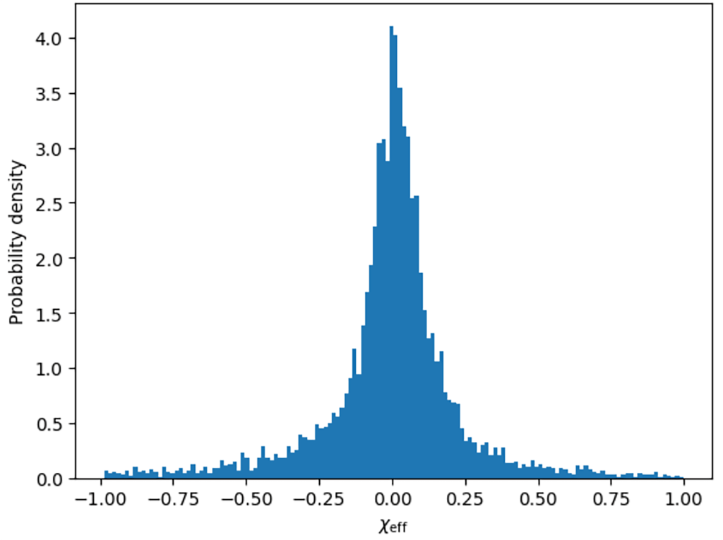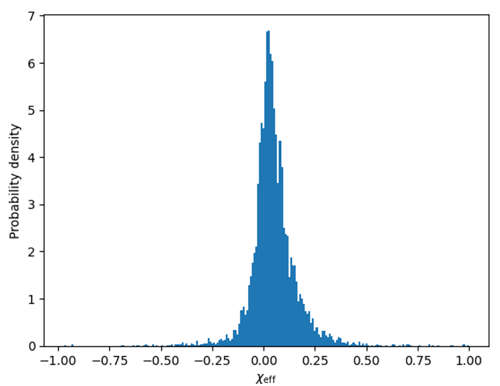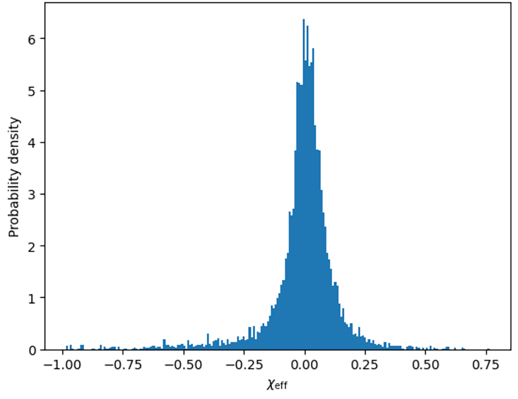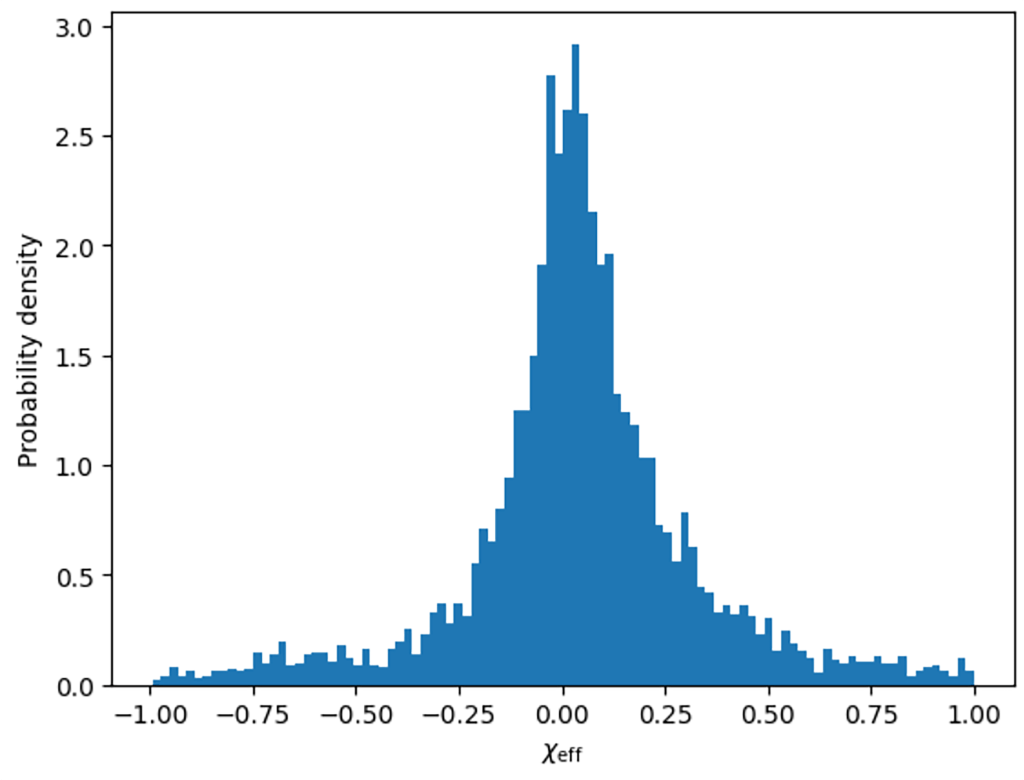 This measurement can be defined as the mass-weighted projection of the individual spins onto the orbital axis, which effectively captures the degree of spin alignment in the system. The distribution of \chi_{eff} within a population is what provides key information about its formation history. Binaries that are formed through isolated binary evolution are likely to have spins aligned with the orbit, which results in larger positive \chi_{eff} values13. On the other hand, dynamically assembled binaries have spin orientations are randomised by the dense stellar environment, exhibiting distributions symmetric around zero11. Thus, comparing the \chi_{eff} distributions for mass-gap mergers and the broader black hole population offers a way to constrain the astrophysical processes responsible for their formation.