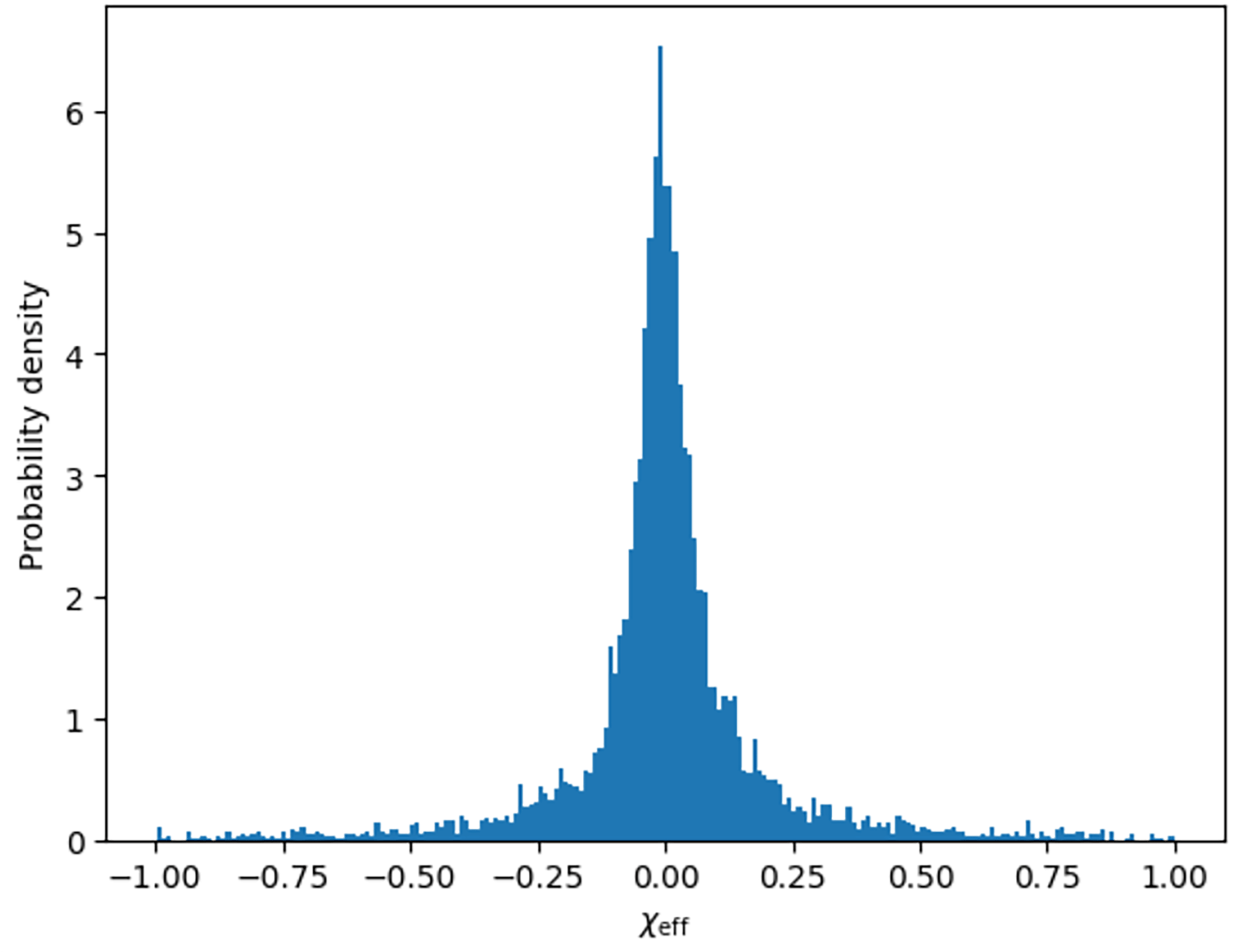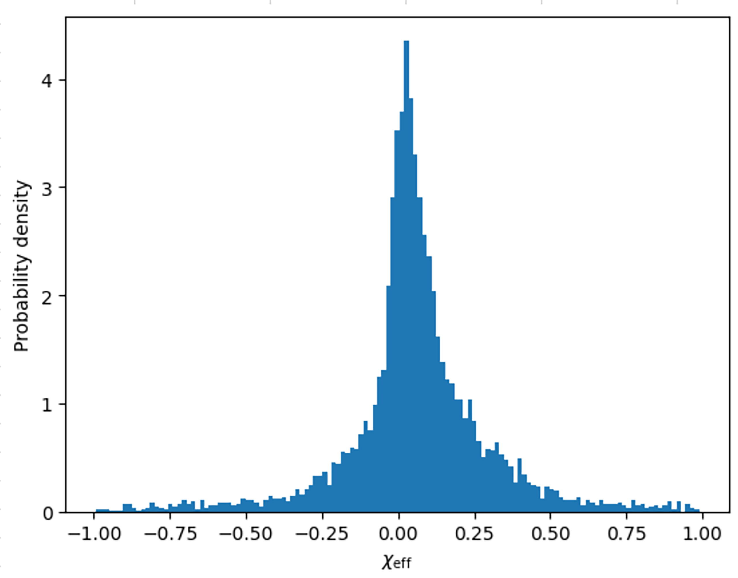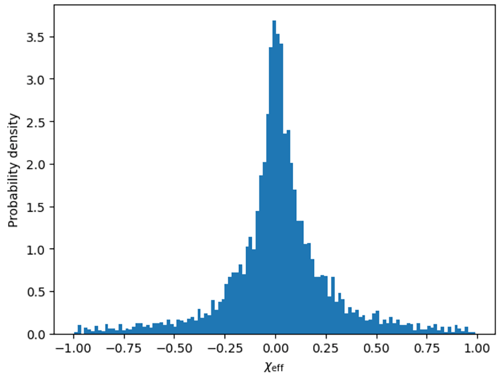 This measurement can be defined as the mass-weighted projection of the individual spins onto the orbital axis, which effectively captures the degree of spin alignment in the system. The distribution of \chi_{eff} within a population is what provides key information about its formation history. Binaries that are formed through isolated binary evolution are likely to have spins aligned with the orbit, which results in larger positive \chi_{eff} values13. On the other hand, dynamically assembled binaries have spin orientations are randomised by the dense stellar environment, exhibiting distributions symmetric around zero11. Thus, comparing the \chi_{eff} distributions for mass-gap mergers and the broader black hole population offers a way to constrain the astrophysical processes responsible for their formation.