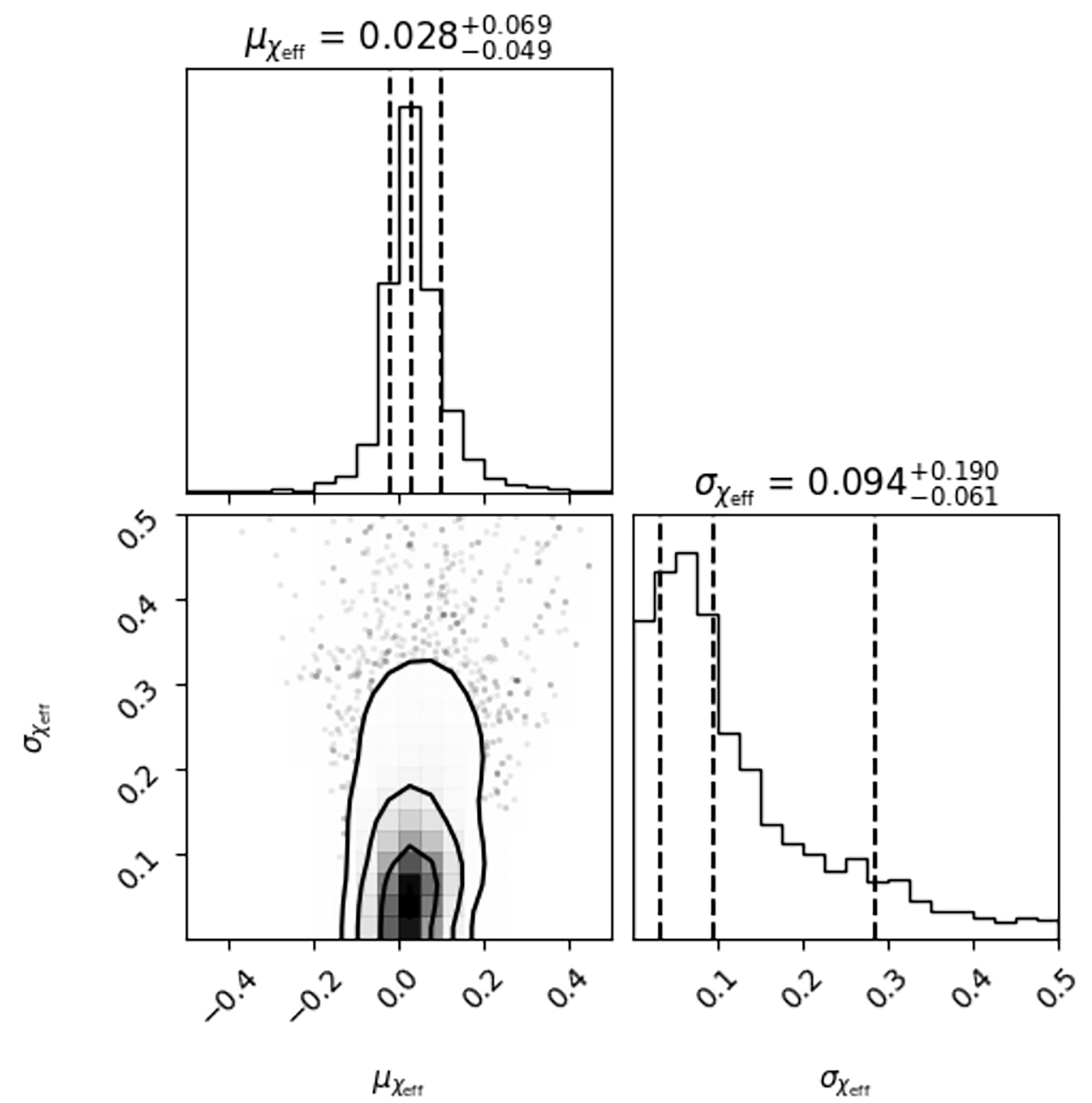 Figure 3 | Corner plot showing the two-dimensional posterior distribution of the population parameters \mu and \sigma for the effective inspiral spin. The contours reveal a mild degeneracy between the mean and standard deviation parameters. This is an important result, as \chi_{eff} \approx 0 is a hallmark of isotropic spin–orbit orientations, which are more typical of dynamically assembled systems than of binaries formed through isolated stellar evolution11 Additionally, the two-dimensional posterior distribution of \mu and \sigma reveals a mild degeneracy. As \mu increases, \sigma tends to decrease, and vice versa. The corner plot illustrates this behaviour clearly, with contour lines enclosing progressively higher percentages of posterior probability. The contours themselves are relatively symmetric, suggesting that the degeneracy is modest but still present.