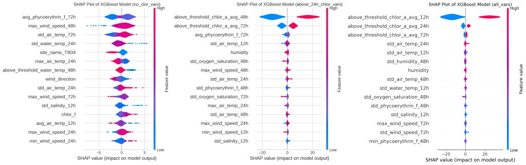 Figure 5 depicts varying levels of threshold data in the XGboost models and the subsequent variable importance through SHAP plots. On the far left, a SHAP plot is made assuming no past chlorophyll-a data is measured and thus is purely predictive. The middle plot assumes a measurement of chlor-a every 48 hours. The far-right plot is the SHAP figure for the most informed model with chlor-a measurements coming in every 12 hours. With no chlor threshold variables, the most important predictors are the phycoerythrin levels, wind speed, and air temp. When chlor variables are measured every 48 hours, the most important variables change to the 48 hour chlor threshold, the 72 hour chlor threshold, and the phycoerythrin levels. Lastly, taking chlor measurements every 12 hours, the most predictive variables changed to the 12 hour chlorophyll threshold, the 48 hour chlor threshold, and the 72 hour chlor threshold.