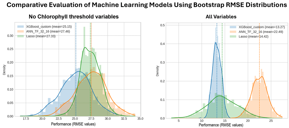 Bootstrap resampling was applied to the test data subset to evaluate and compare the predictive performance of the ANN, XGBoost, and Lasso models using all available predictor variables, and a reduced predictor set excluding chlorophyll threshold variables. For each bootstrap iteration, RMSE values were computed, generating empirical performance distributions for each model (Figure 1). The analysis reports comprehensive descriptive statistics to summarize the central tendency and variability of model performance. Table 5 presents the descriptive statistics of the bootstrap RMSE distributions for all models and predictor configurations.