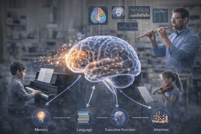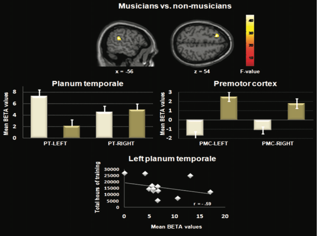 Findings have show that music training significantly enhances cognitive and neural functions that distinguish musicians from non-musicians. Musicians demonstrate superior executive functioning, including better cognitive flexibility, working memory, and verbal fluency. fMRI scans show that trained musicians, especially children, have increased brain activity in areas associated with complex cognitive tasks. Additionally, the musicians showed enhanced processing in the left planum temporal (PT), an area of the brain critical for interpreting rapidly changing.