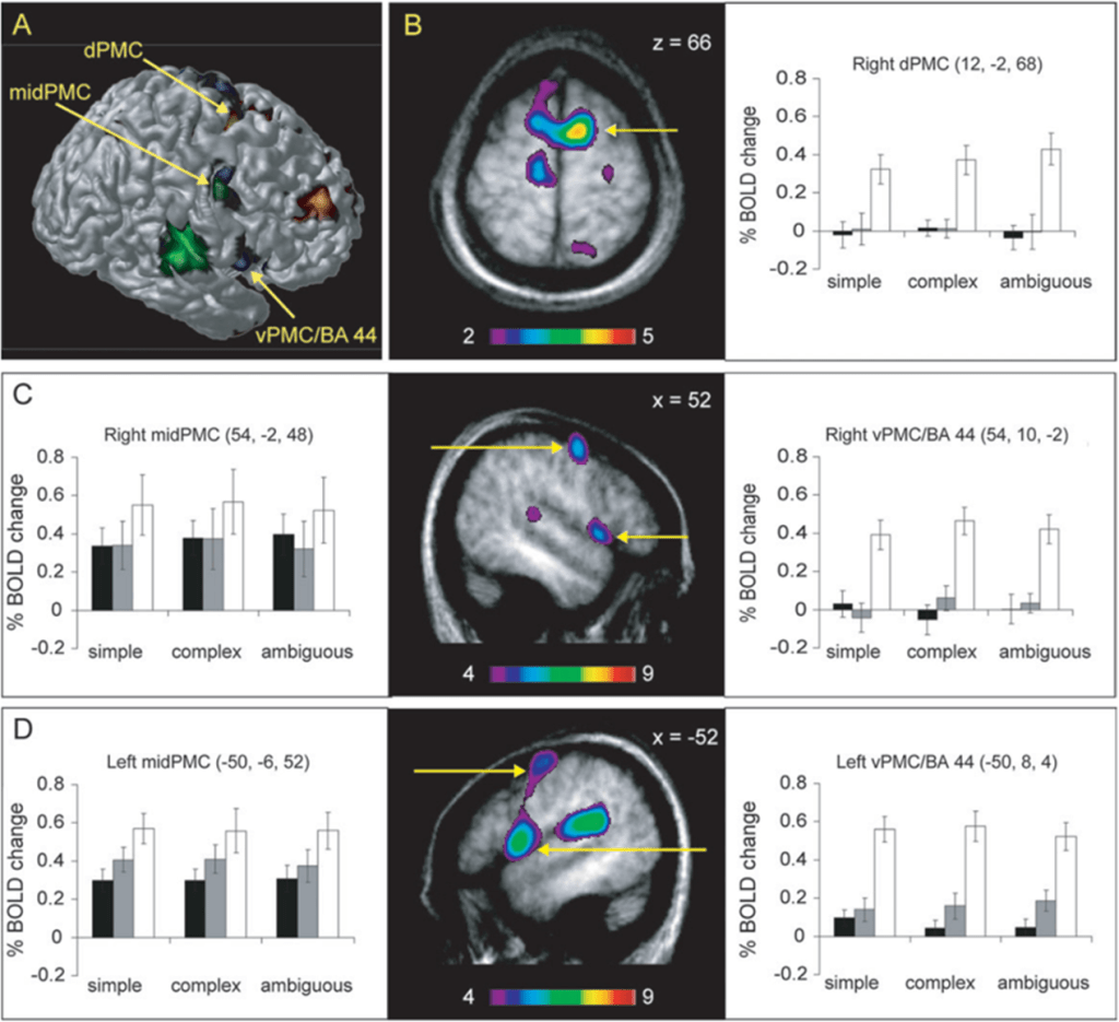 Furthermore, the study highlights the important interaction between auditory (sensory) and motor systems in musical performance.16 This paper investigates the involvement of motor areas of the brain during the perception and production of musical rhythms using two fMRI studies. In experiment 1, subjects first listened with anticipation and then tapped to a musical rhythm, and the results showed that the supplementary motor area (SMA), middle premotor cortex (PMC), and cerebellum were activated before tapping, suggesting involvement in motor planning or rehearsal. In experiment 2, subjects listened to the rhythm naively, unaware that they would later tap, but the same motor areas were activated, suggesting that the motor system can be engaged purely by rhythmic auditory stimulation, without motor preparation. The ventral PMC (vPMC) was engaged only during action and motor coupling, while the dorsal PMC (dPMC) was sensitive to rhythmic complexity, suggesting a role in higher-order temporal processing. The middle PMC showed consistent activation in all conditions, suggesting a general role in tracking sequential auditory events. In addition, the SMA responded strongly during motor sequences. These findings suggest that there is a natural coupling between the auditory and motor systems and that motor areas are affected by rhythmic stimulation even in the absence of an explicit motor task.