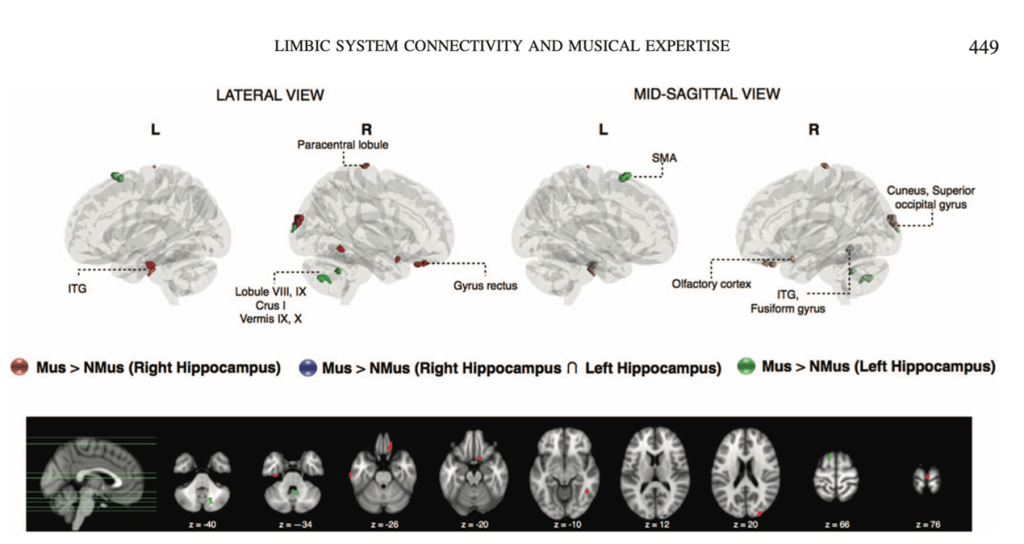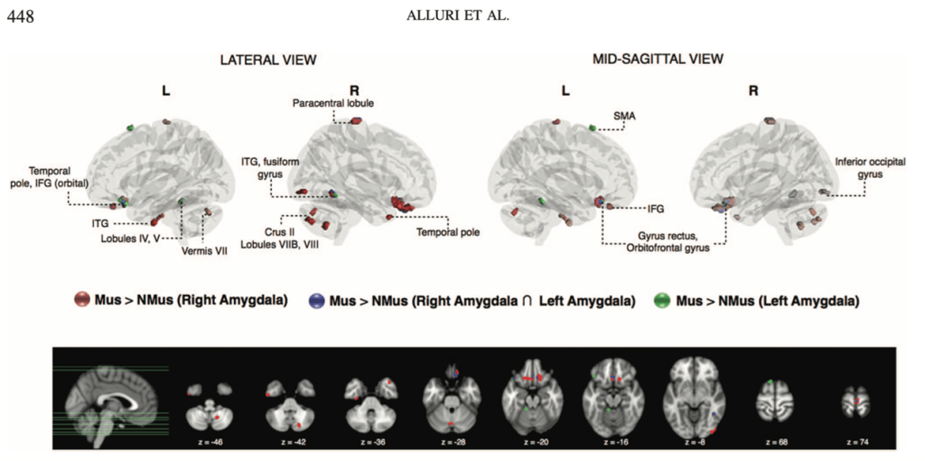 Taken together this evidence indicates that, when listening to music, musicians exhibit stronger generation and processing of negative emotions, storage and retrieval of memories, and activity of the reward pathway than non-musicians.