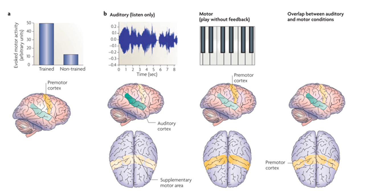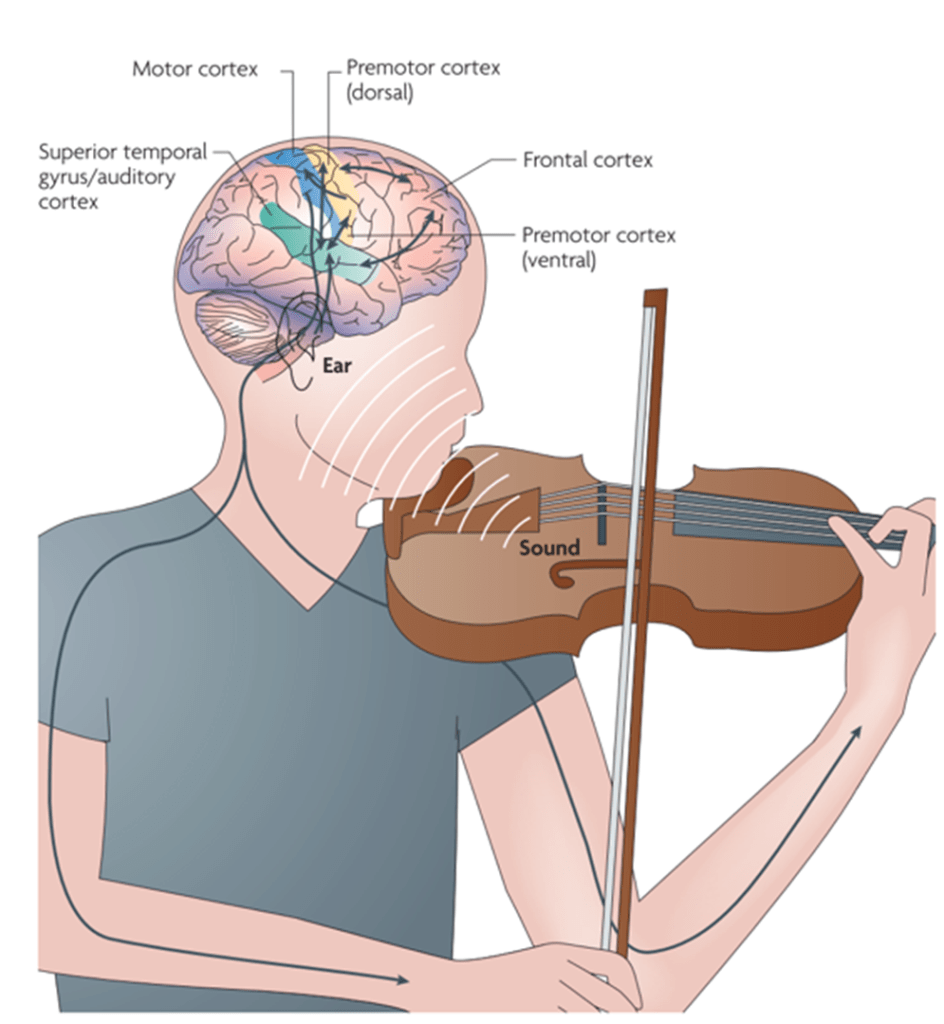 The auditory system provides continuous feedback that influences motor output.14 For example, each movement a musician performs produces a sound that in turn influences subsequent movements, creating a continuous feedback loop. The premotor cortex (PMC) is particularly important in this integration because it helps synchronize auditory input with motor actions, ensuring that the timing and organization of movements are consistent with the structure of the music. (as shown in Figures 5 and 6)