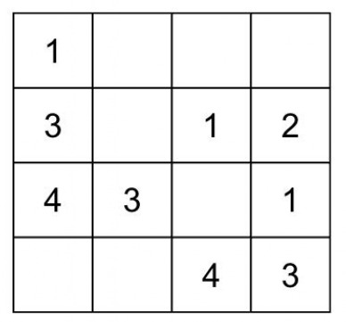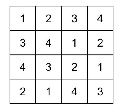 To illustrate the concept, consider a smaller 4 × 4 Sudoku puzzle. The grid is divided into four 2 × 2 blocks. The digits to be placed are 1 through 4. In this puzzle, the goal is to fill the empty cells so that each row, column, and 2 × 2 block contains all of the digits from 1 to 4 exactly once.