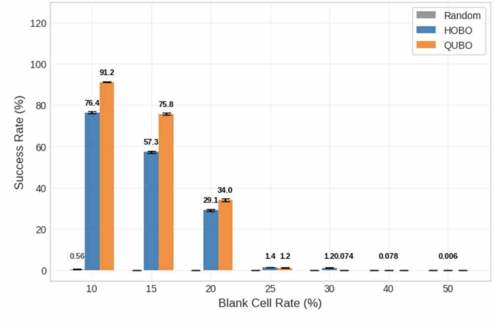 Figure 6 summarizes the ratio of optimal solutions sampled as the blank-cell rate increased on the 9×9 board. At 10% and 15% blanks, the recorded success rates are higher for QUBO; by 20%, both counts have decreased, but QUBO still reports a larger value in the plotted dataset. Starting at 25% blanks, the HOBO bar exceeds the QUBO bar and the difference widens as sparsity grows in the figure. At 40% blanks, QUBO shows zero success rate in the plotted run, while HOBO retains a small but nonzero success rate; at 50% blanks the chart annotates a single HOBO hit with a success rate of 0.002%. This represents the limitation and further improvements required for HOBO solvers. However, this is important in quantum computing, because the fact whether optimal solution is executed matters and not the rate. For example, random guessing is displayed as 0% successful, which implies the significance for HOBO for reaching to an optimal solution. Ultimately, Statistical testing confirms QUBO’s significant lead at 10-20% blank rates (p < 0.001). However, the crossover at 25% marks a significant shift, with HOBO outperforming QUBO from 25% through 40% (p < 0.001). At 50%, while HOBO retains unique solutions, the difference is not statistically significant (p = 0.08) due to the extreme scarcity of successful samples.