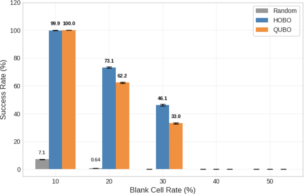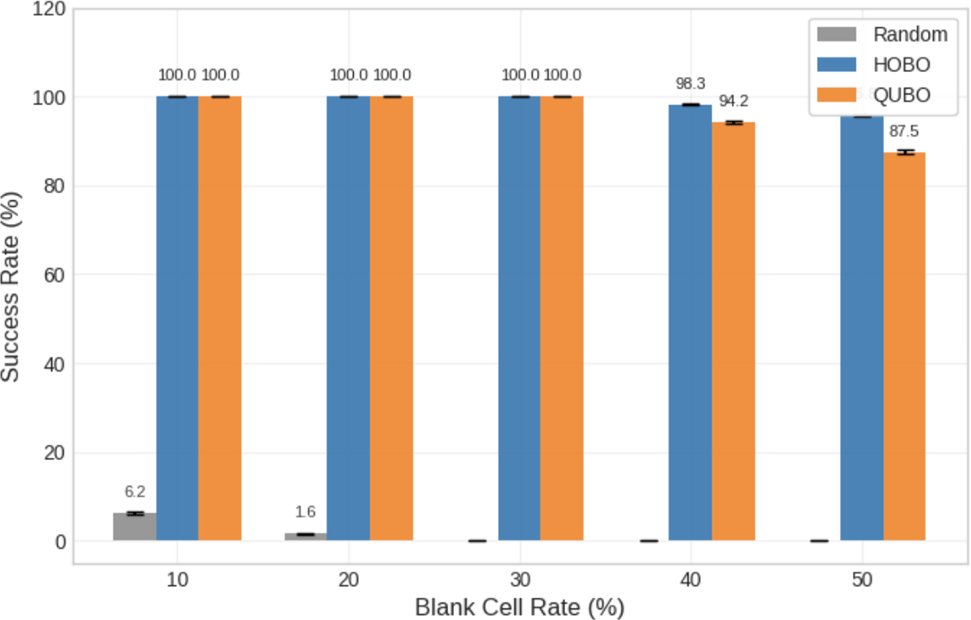 These results demonstrate that not only the number of blank cells but also their spatial distribution critically affects optimization performance. Sparse placement activates row, column, and block constraints more uniformly across the grid, allowing HOBO’s higher-order terms to cooperatively propagate information and eliminate infeasible configurations. In contrast, clustered blanks leave large regions under-constrained, limiting the effectiveness of both methods—especially QUBO’s pairwise interactions.