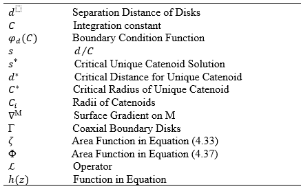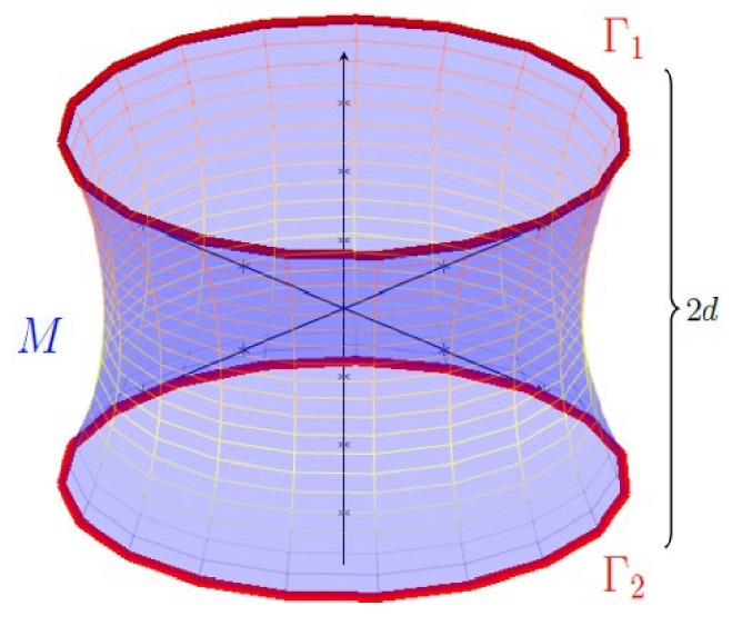 - M. Shiffman, On surfaces of stationary area bounded by two circles, or convex curves, in parallel planes, Ann. of Math. Vol. 63, pg. 77–90, 1956. https://www.jstor.org/stable/1969991 [↩]