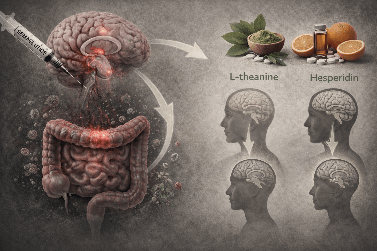 Future directions include the assessment of semaglutide in other in vivo models of behavior or physiology (e.g., circadian rhythm, affective behaviors or sleep) or models that create a microbiota-modulating condition, epithelial-specific manipulations or receptor inhibition or agonism. Such an approach may help us to identify the signaling mechanisms and cell types that semaglutide acts through within the gut-brain axis. Further investigations of other molecular endpoints for L-theanine and hesperidin may reveal whether they are acting transcriptionally, post-transcriptionally, or through antioxidant or metabolic modes of action.
