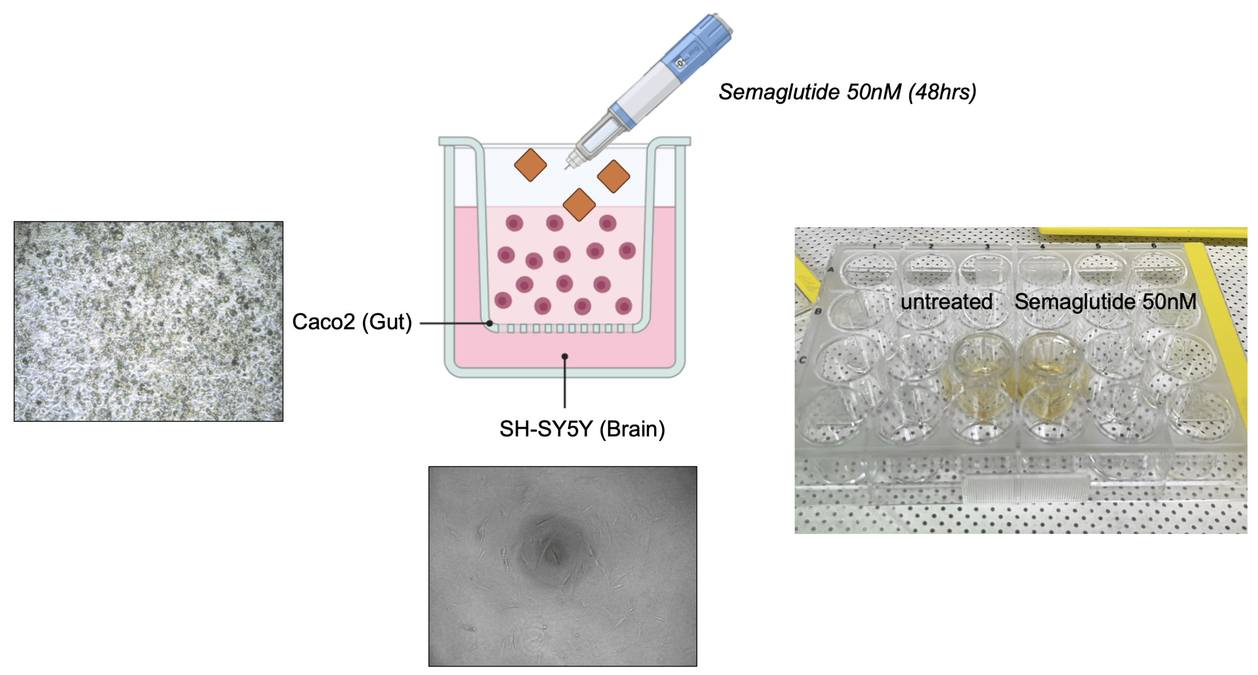 Caco-2 cells (intestinal epithelial) were seeded on the apical insert of a transwell plate, while SH-SY5Y neuroblastoma cells were cultured in the basolateral compartment. After 10 days of differentiation for barrier formation, semaglutide (50 nM) was administered to the Caco-2 cells for 48 hours. The SH-SY5Y cells were then harvested to assess downstream molecular changes.