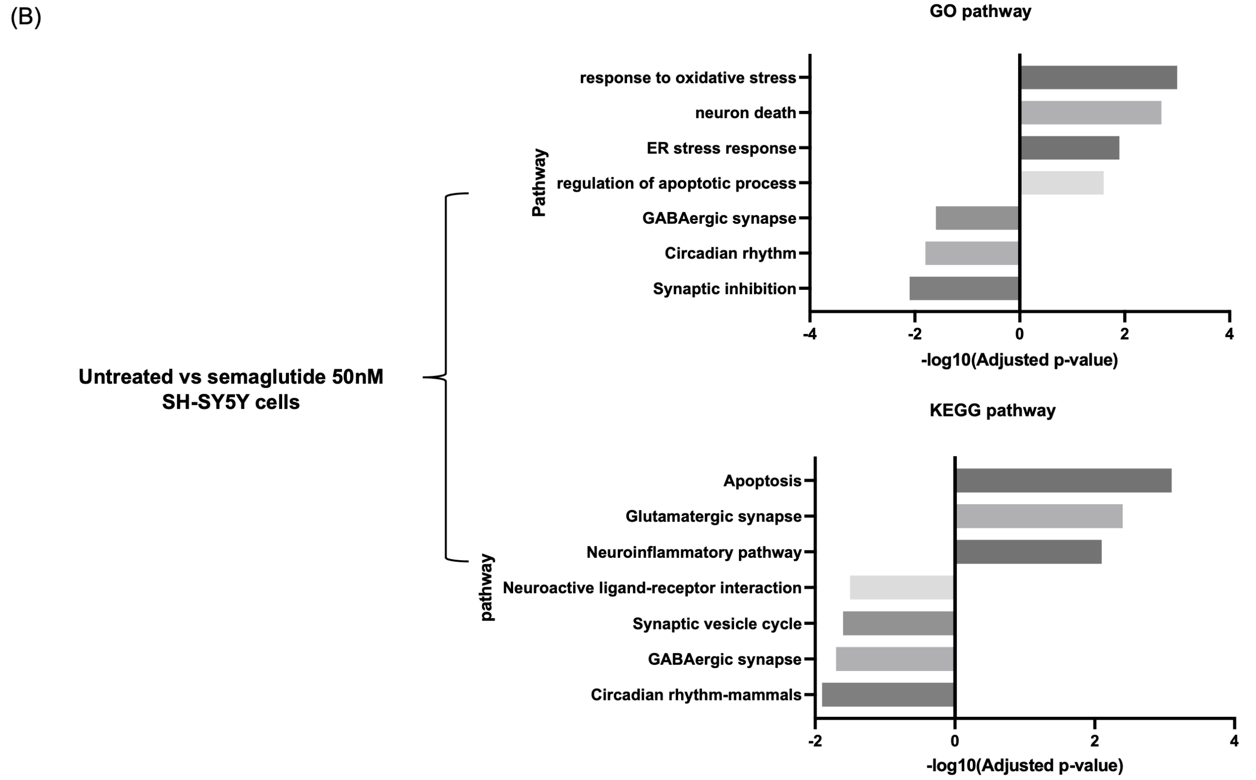 Total RNA was extracted from SH-SY5Y cells and subjected to RNA sequencing. DEG analysis revealed significant transcriptional changes between control and semaglutide-treated conditions. Specifically, 268 genes were upregulated and 315 genes were downregulated (adjusted p < 0.05, fold change > 1.5) (Figure 2A).
