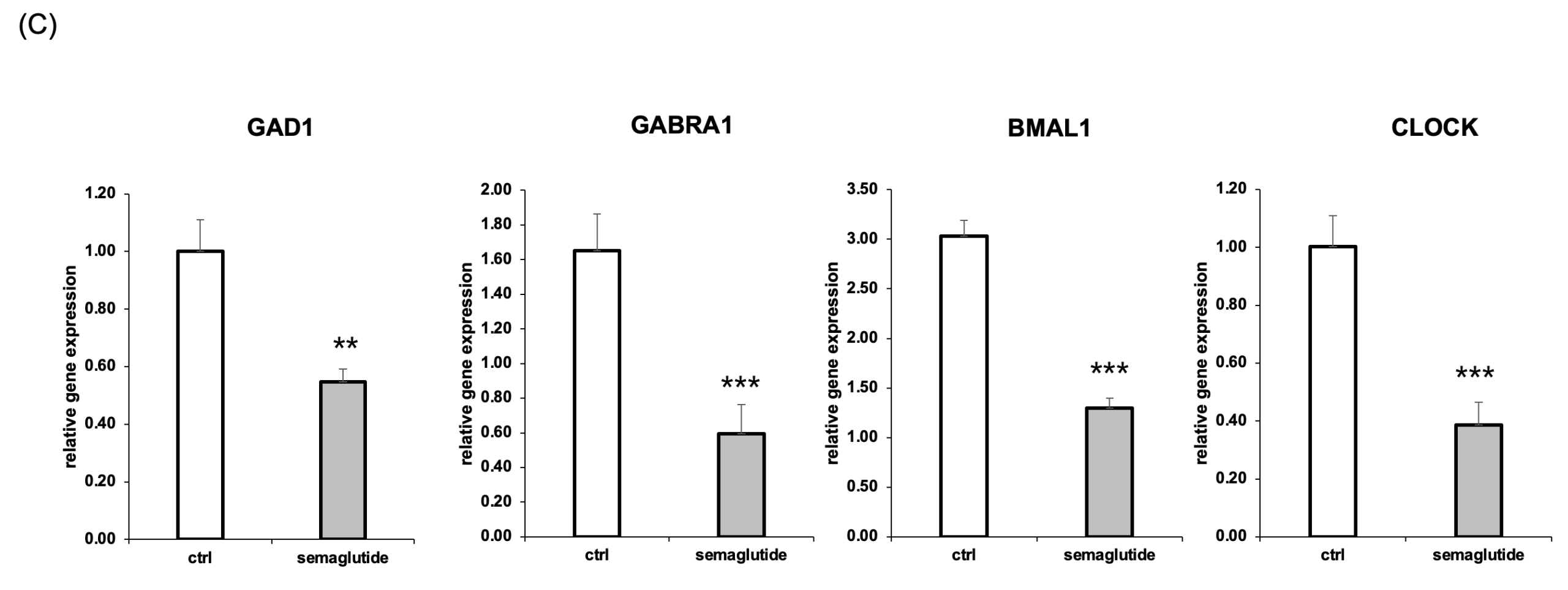 (c) Relative mRNA expression levels of GAD1, GABRA1, BMAL1, and CLOCK were significantly reduced in semaglutide-treated groups compared to untreated controls, as measured by RT-qPCR. Data are presented as mean ± SEM (n=3); (**p < 0.01, ***p < 0.001).