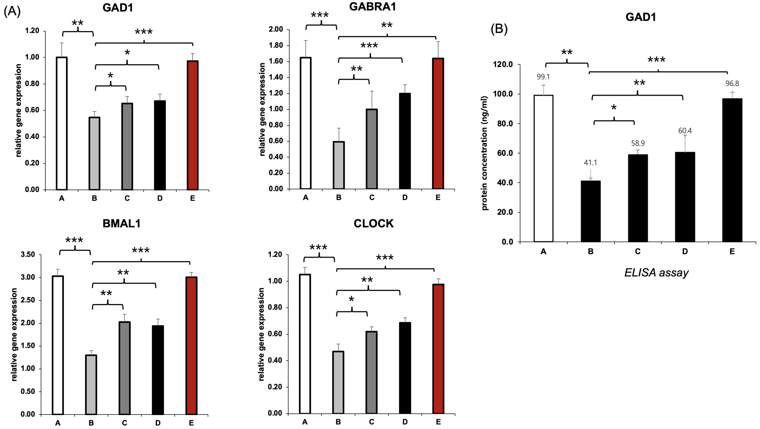 To determine whether the suppression of GABAergic and circadian genes induced by semaglutide could be reversed, we performed RT-qPCR analysis of GAD1, GABRA1, BMAL1, and CLOCK in SH-SY5Y neuronal cells following 48 hours of treatment (Figure B). We compared five groups: untreated control (A), semaglutide-only (B), semaglutide with L-theanine (C), semaglutide with hesperidin (D), and a combination treatment with both natural compounds (E).