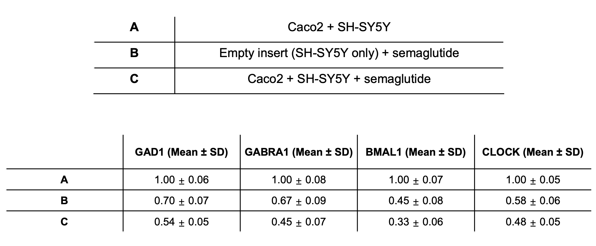 To determine whether semaglutide-induced neuronal changes resulted from direct exposure or required epithelial-mediated signaling, we compared gene expression profiles between an “empty-insert” condition and the Caco-2 co-culture system. Direct exposure of SH-SY5Y cells to semaglutide through an empty insert led to a modest reduction in inhibitory neurotransmission and circadian-related genes, with GAD1, GABRA1, BMAL1, and CLOCK (Table 2).