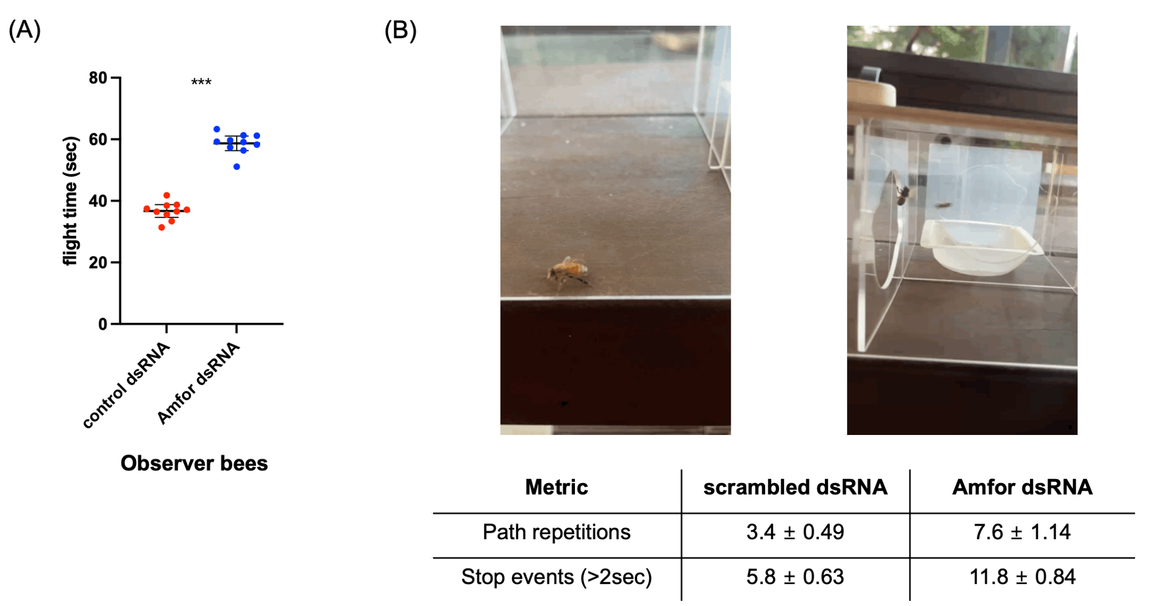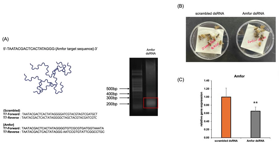 Observer bees were fed with 50% sucrose solution supplemented with 1 µg/µL of Amfor dsRNA or scrambled dsRNA. Sterile filter paper disks soaked in the dsRNA-sucrose mixture were placed in Petri dishes, and bees were allowed to consume the solution ad libitum for 24 hours in a controlled incubator (33°C, 60% RH).