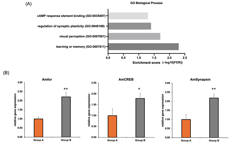 (B) Bar graphs showing the relative expression of key genes. The expression levels of AmCREB, Amfor, and AmSynapsin were significantly higher in observer bees (Group B) compared to control bees (Group A). Data are presented as mean ± SEM. * indicates p<0.05, ** indicates p<0.01.