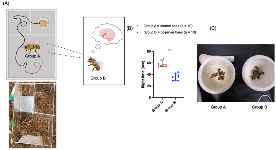 (B) Comparison of flight time between Group A and Group B. Observer bees (Group B) took significantly less time to complete the maze compared to control bees (Group A), demonstrating the effectiveness of visual observational learning. Data are presented as mean ± SEM. *** indicates p<0.001.