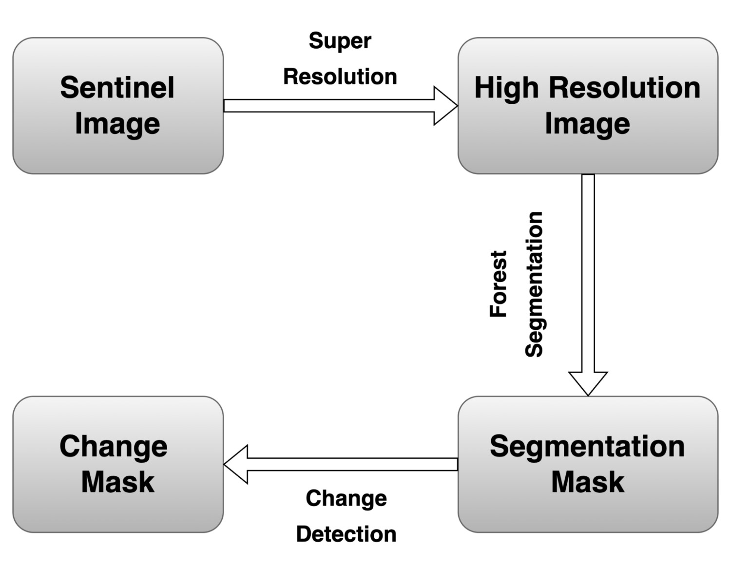 Figure 1 | General pipeline for detecting change mask using images with Super Resolution