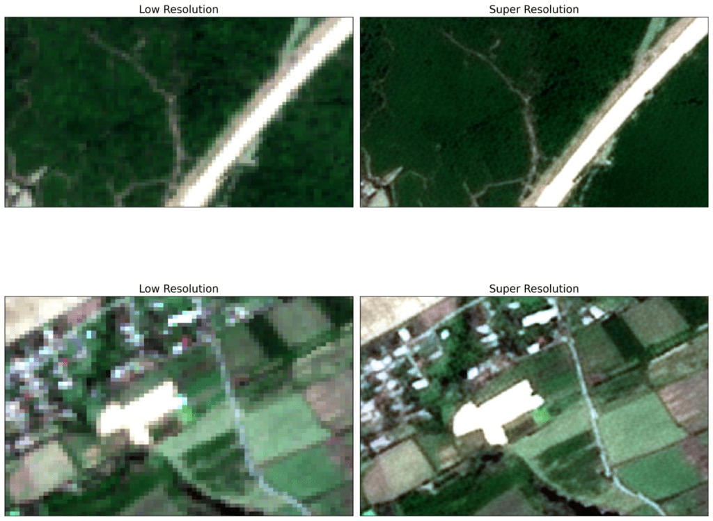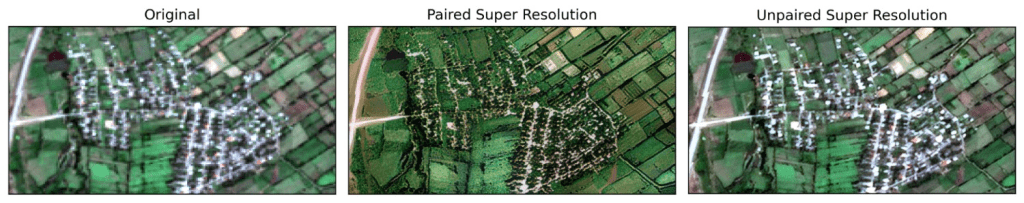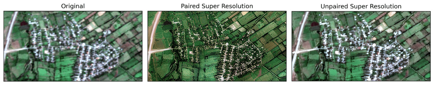 Recognizing the unique requirements of remote sensing applications, RS-ESRGAN is an addition of ESRGAN, created specifically for remote sensing imagery. Improvements include removing the upsampling layers in the generator which helps facilitate training with co-registered WorldView and Sentinel-213 image pairs. This allows the model to learn the mapping between lower-resolution Sentinel-2 and higher-resolution WorldView imagery. These changes allow RS-ESRGAN to have better performance on Sentinel-2 imagery that can be observed both visually and with quantitative metrics, and it preserves spectral information11.