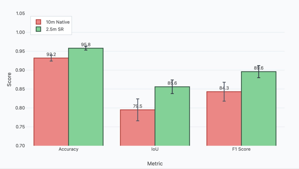 The practical implications of these findings extend to operational forest monitoring systems currently deployed at a global scale. While global monitoring systems such as Global Forest Watch rely on Sentinel-2’s 10 m native resolution, our findings demonstrate that super-resolution preprocessing can bridge much of the gap to commercial high-resolution imagery while retaining the global accessibility of free Sentinel-2 data. This enables finer-scale detection of forest loss and boundary changes than current operational platforms, offering a practical pathway to enhance existing global monitoring frameworks with sub-hectare precision. Such improvements are particularly valuable for detecting small-scale deforestation events, illegal logging activities, and subtle forest degradation that may be missed at coarser resolutions.