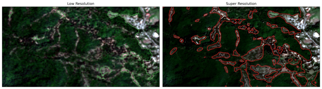 Further evidence for the importance of spatial resolution comes from comparative studies: comparison between deforestation detection accuracy using native resolution Sentinel-2 imagery and higher-resolution imagery like PlanetScope (with a resolution of 3-4 meters) also shows the advantages of increased spatial detail28. One experiment showed that PlanetScope imagery provided a higher quality of segmentation for deforestation detection compared to Sentinel-2 data, suggesting that finer spatial resolution allows for better discrimination of deforested areas28. This observation gives a credible reason for using super-resolution techniques to bridge the resolution gap between Sentinel-2 and higher-resolution sources.
