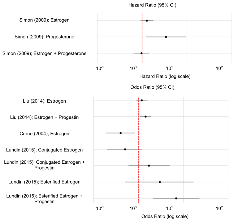 After collecting and filtering studies, we organized our quantitative data into three figures in the form of forest plots: one study about the effect of estrogenic compounds on the risk of Parkinson’s disease, one about how duration of use of estrogenic hormones affects the risk of Parkinson’s disease, and one about how the type of estrogenic hormone affects the risk of Parkinson’s disease. All three of these forest plots involve analyzing odds ratios, hazard ratios, and/or risk ratios; the type of ratio depicted depends on the studies being analyzed. These figures were made using Copilot. We also recorded qualitative data about each study, such as the main ethnicity studied, whenever it was feasible. Finally, we recorded our results, both quantitative and qualitative, in an organized manner.