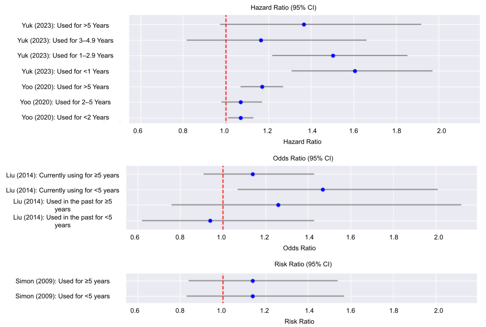 In Figure 3, we plotted the hazard ratios, odds ratios, and risk ratios associated with specific time intervals from four studies, along with their 95% CI ranges. We used Model 1 for data adjustment of Liu (2014), which means that its data is adjusted for continuous age, race, smoking, and caffeine. We used Model 3 for data adjustment of Yoo (2020), which means that its data is adjusted for duration of fertility, parity, duration of breast feeding, duration of HRT, duration of oral contraceptive use, alcohol consumption, smoking, regular exercise, income, body mass index, hypertension, diabetes mellitus, dyslipidemia, and cancer. The data shows that while hormone use generally increases the risk of Parkinson’s disease, the highest risks tend to appear at the shortest and longest periods of use.