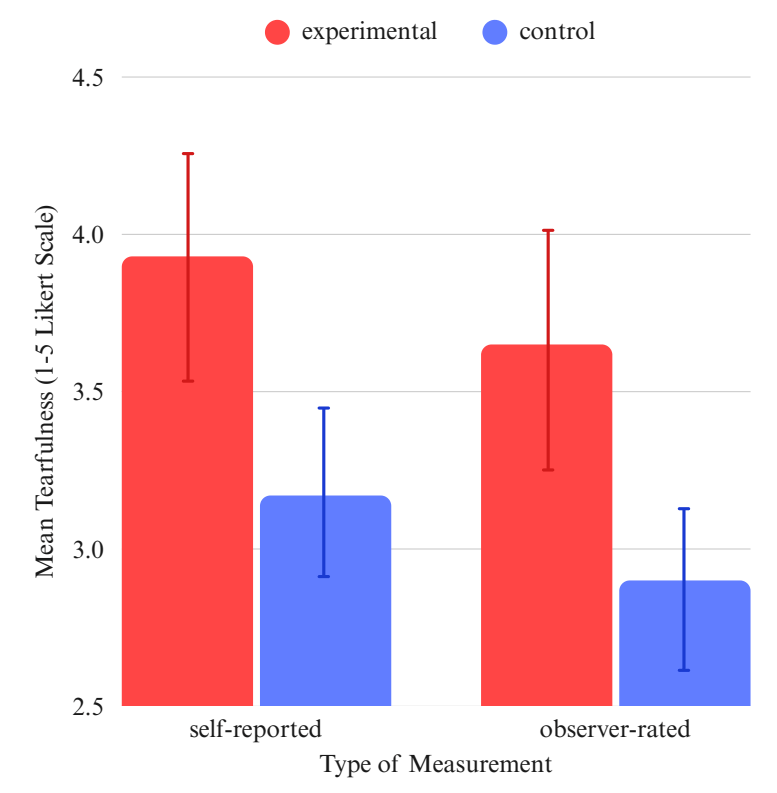 As we expected, participants in the experimental group tended to exhibit higher levels of tearfulness than those in the control group.