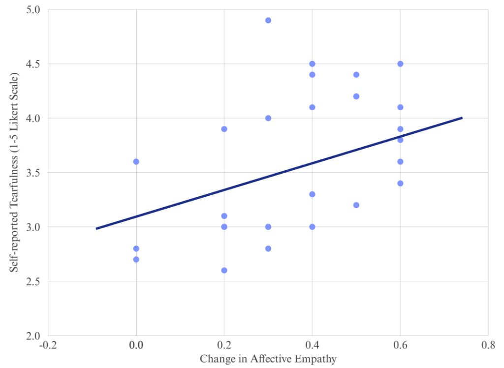 Figure 2 | Scatterplot illustrating the positive association between changes in affective empathy and self-reported tearfulness (r = 0.52, p < 0.05, 95% CI [-0.02, 0.82]). The regression line is illustrative, representing the positive trend based on observed data.