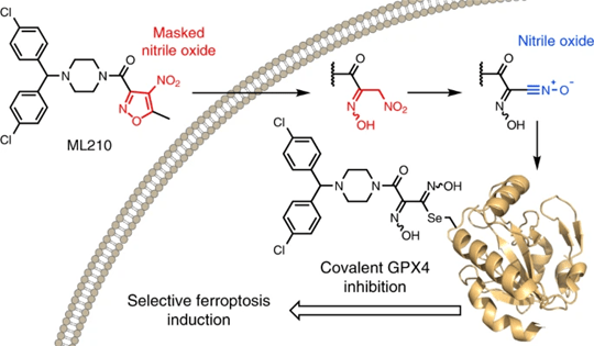 The structure of GPX4 features a highly specific active site, making it difficult to target with traditional small-molecule binding. ML210, however, is a prodrug that is capable of undergoing various transformations necessary to covalently bind to and inhibit GPX4. This prodrug possesses a masked nitroisoxazole group that exhibits structural features that are vulnerable to chemical changes. Since it is not reactive in its initial state, a cellular transformation is required to become an active electrophile that inhibits its target protein17.