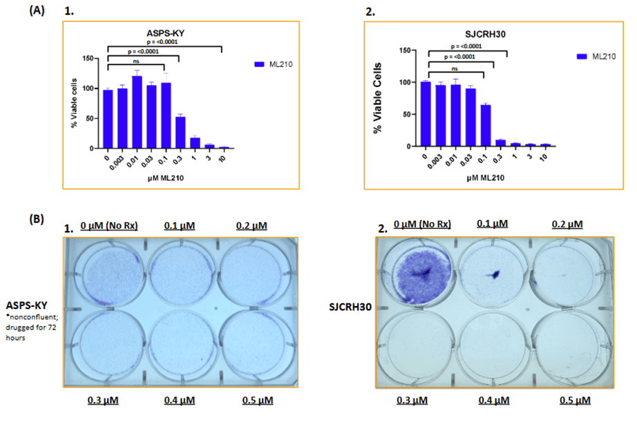 ML210 demonstrates noticeable effects in both ASPS-KY and SJCRH30 cell lines. Based on the CTG assay (A1), ASPS-KY cells exhibited a reduction in cell concentration from 0.1 μM to 0.3 μM, indicating a susceptibility to reduced cell viability. The visual gradient from the Crystal Violet assay (B1) indicates the effect of ML210 in ASPS-KY cells by portraying reduced cell concentration at high intensities of ML210 such as 0.3 μM, 0.4 μM, and 0.5 μM when compared to 0 μM. Similarly, CTG data of SJCRH30 cells (A2) showed a relatively steady decrease in cell viability from 0 μM to 0.1 μM, followed by a dramatic reduction at 0.3 μM. Moreover, results from the Crystal Violet (B2) assay demonstrated the effect of ML210 in SJCRH30 cells by revealing a weak presence of a purple gradient from 0.3 μM to 0.5 μM when compared with the No Rx well. Using CTG data, the IC50 defined as the concentration of ML210 required to reduce cell viability by 50%, was calculated to be approximately 0.1137 μM for SJCRH30 cells and approximately 0.295 μM for ASPS-KY cells.