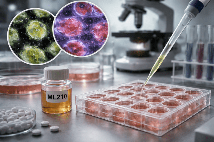 The goal of this study was to identify the effectiveness of ML210 on two types of sarcomas: alveolar (ASPS-KY) and rhabdomyosarcoma (SJCRH30). We conducted this study with the intention of analyzing a potential protein inhibitor for these forms of cancer. ML210 is a prodrug known to inhibit the enzyme glutathione peroxidase 4 (GPX4), whose function in preventing ferroptosis is relied upon by cancer cells for survival. When present, this inhibitor undergoes various transformations to acquire the necessary structure for GPX4 inhibition. ASPS-KY and SJCRH30 cell lines were grown in the laboratory and treated with ML210, and the CellTiter-Glo and Crystal Violet assays were performed to analyze cell viability. Results from the CTG assays showed a decrease in cell viability corresponding to increasing ML210 concentrations (0.003–10 μM), notably at marked reductions beginning at 0.3 μM. Calculated IC50 values were approximately 0.1137 μM for SJCRH30 cells and 0.295 μM for ASPS-KY cells. Visual representations from the Crystal Violet displayed a decreasing gradient with intensified ML210 concentrations (0.1–0.5 μM) in both cell lines. Because of scheduling difficulties, a Western Blot analysis was not conducted to confirm decreasing GPX4 levels with increasing ML210 concentrations. Though it is known that ML210 inhibits GPX4 activity, we recommend future researchers to conduct a Western Blot and ferroptosis rescue to confirm that GPX4 is inhibited specifically in ASPS-KY and SJCRH30 cells and such reduced viability is due to ferroptosis.